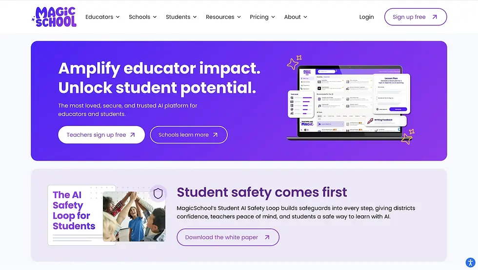 Magic School's homepage also uses "The Elephant In The Room Principle." They address the one thing that comes to mind when the conversation turns to school and AI. And that's student safety.